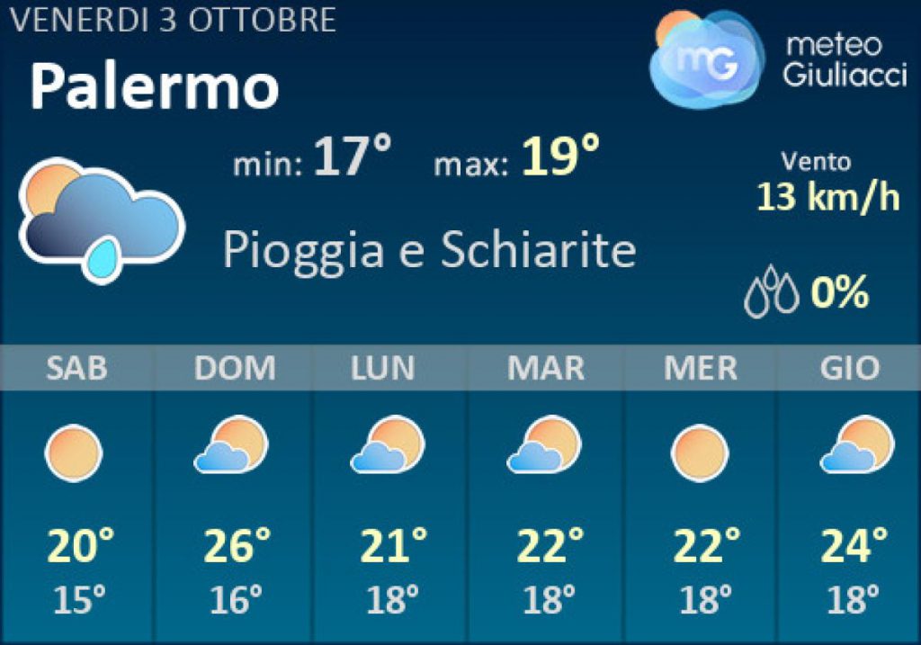 A Palermo la settimana sarà segnata da piogge intermittenti e venti moderati, con qualche schiarita verso il weekend. Le temperature resteranno miti, oscillando tra i 13 e i 19 °C.